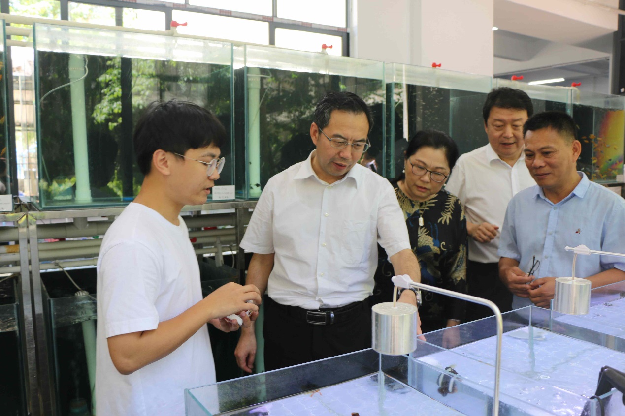 在热带海洋生物生物资源利用与保护教育部重点实验室,王斌在韩秋影、李卫东、黄海等教授的指引下,先后参观了海草研究室、珊瑚研究室、水产养殖研究室,询问了研究室的人员构成、研究方向等内容,听取了关于实验室目前开展海草和珊瑚的人工扩繁、水产养殖、环境毒理等方面的研究汇报,了解了海草、珊瑚、鱼类等领域研究的进展情况。在珊瑚研究室,伊朗籍研究人员阿里的光污染对珊瑚影响的研究受到王斌关注,他叮嘱要做好珊瑚的研究工作,把科学研究应用到实际中,为海南的海洋生态环境建设和提升做好服务。