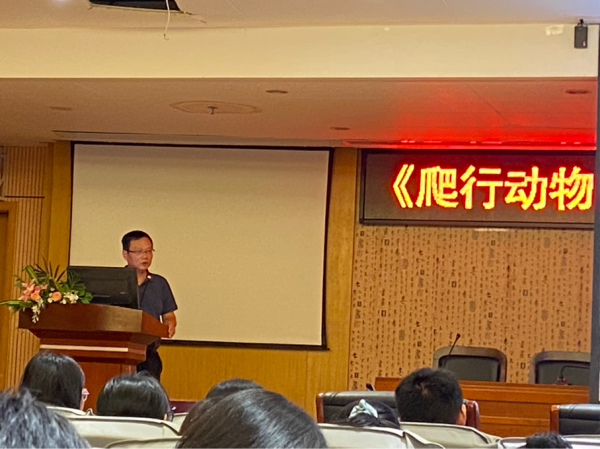 在计翔教授讲授完后,黄海副经理先向同学们询问是否对本次讲座存在相关知识的疑问,而后结合自身感受以及对两栖爬行动物某方面的疑惑向教授提出问题。计翔教授就黄副经理提出的问题解答后,邱清波书记向同学们说到,计翔教授曾经是自己的老师,希望准备考研或者有意向考研的同学能够加油努力学习,日后能到计翔教授的实验室去。