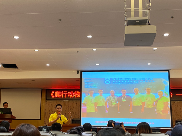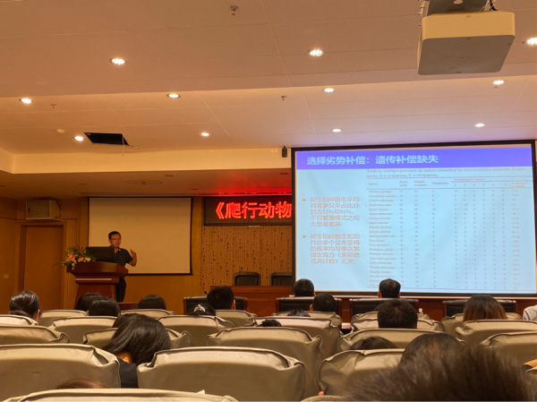 讲座开始前黄海副经理简单介绍了计翔教授个人事迹及其相关研究方向课题,并对员工提出认真听讲、做好笔记、手机静音等要求。讲座开始,计翔教授对本次学术报告进行简单介绍,然后从爬行动物的独特性讲起,继而从爬行动物卵胎生的进化和劣势补偿几方面开始讲解。他详细阐述了爬行动物卵胎生的成因及其相关假说,并对卵胎生物种选择补偿机制提出了自己的见解。整个学术报告讲解过程条理清晰、逻辑严密、内容丰富,体现了计翔教授深厚的学识功底。