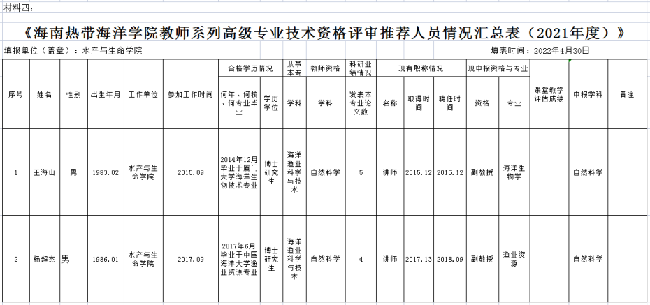 根据热海大办〔2022〕36号文件《英国365集团2021年度教师、实验系列副高级专业技术资格评审工作实施方案》,经个人申报,公司评议小组初审,杨超杰、王海山符合2021年度教师系列副高级专业技术资格申报条件。按照公司要求,现将申报材料一、二、三线下公示(公司办公室8613),材料四线上公示。